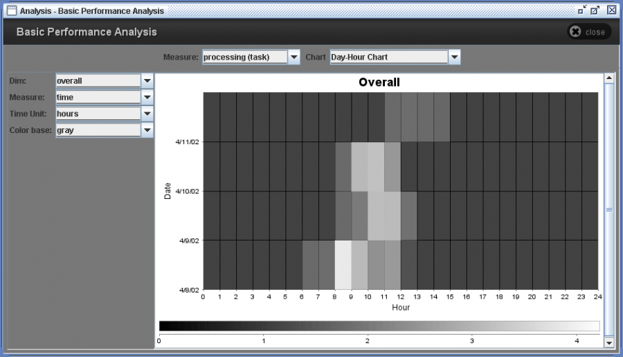 Day-Hour Chart shows the density of works on a day-hour matrix. In a Day-Hour chart, x-axis refers to a day from 0:00 to 24:00. Y-axis shows dates from the start to the end of a process log. A box on the chart represents a time unit and the color of it shows the density of works.
