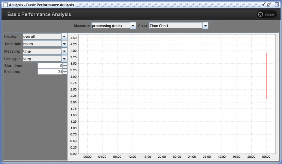 ResultsThe result panel consists of several options and resulting graph. There are two major performance measures. They are measures for tasks (processing) and measures for instance (throughput). And it provides 9 kinds of graphs such as Bar chart, Pie chart, Spider chart, Box-and-Whisker chart, Gantt chart, Time chart, Day-Hour chart, Meter chart, and text view of the result.
