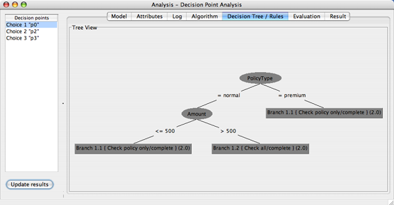 Now we are ready to invoke the analysis. By pressing the button Update results a decision tree is being created for each decision point by the classification algorithm J48. The following section shows how it can be interpreted in order to derive knowledge about what attributes have most likely influenced the corresponding choices.