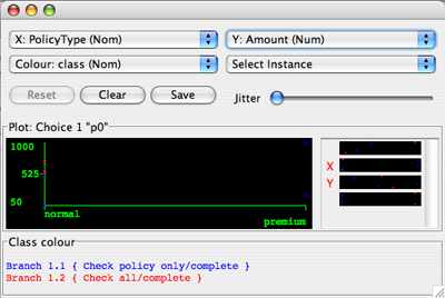 Furthermore, you can export the classification problem for the corresponding decision point as an .arff file (just click on the top-node in the decision tree and press “Save” in the dialog shown in Figure 8), which can then be loaded into the Weka workbench to see which results are given by other classifiers not yet supported by the Decision Miner. Try, for example, a rule learner such as JRip, which will discover If-then rules rather than a decision tree.