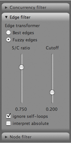 Fuzzy edges filterThe fuzzy edges filter ranks all connected edges of a node locally. The parameter S/C ratio configures the evaluaton method for this ranking, as a ratio between significance and correlation. When the S/C ratio is set to 1.0, only the most significant edges will be preserved; conversely, a value of 0.0 will only take correlation into account.