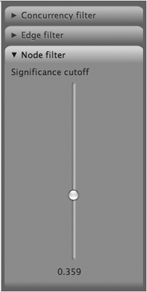 The node filter controls the amount of event classes which will be included in the displayed graph. It features a single control, the significance cutoff. All event classes with an aggregate significance measure lower than the value specified in the significance cutoff will be subject to filtering. Depending on their environment, they will be either removed from the graph or aggregated in a cluster.