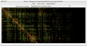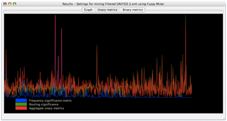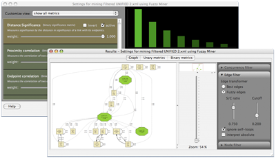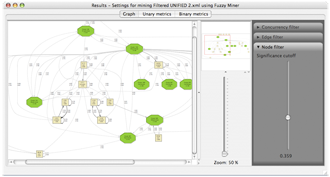 The ultimate goal of the Fuzzy Miner is to create an appropriate graph representation of the process expressed in the mined log. The graph view allows you to explore this graph, and to finely tune the way it is derived from the metrics which have been measured in the first phase.