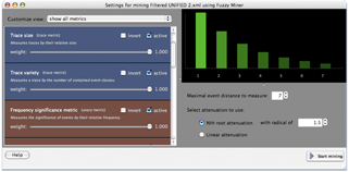 Measurement phaseThe measurement phase is straightforward to use and understand: Just click the start mining button on the lower right, and the measurer will apply all metrics to the log, using the number of measurement points and attenuation you specified. The aggregate metrics which are created in this step will then be used for the final mining phase.