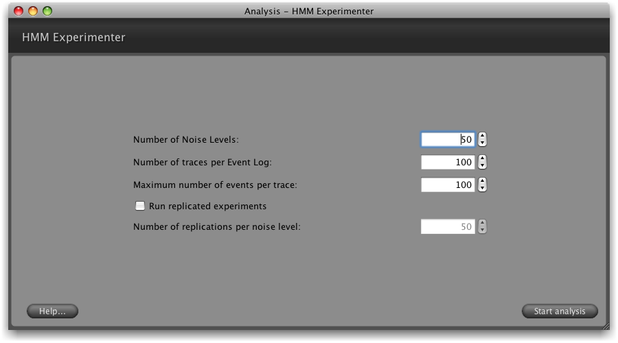 HMM Experimenter Settings- No. of Noise Levels. The number of different noise levels to be generated. Being always distributed from 0% to 100%, the number of noise levels affects the granularity, or noise step size. For example, 10 noise levels result in logs generated with 10%, 20%, …, 100% noise.