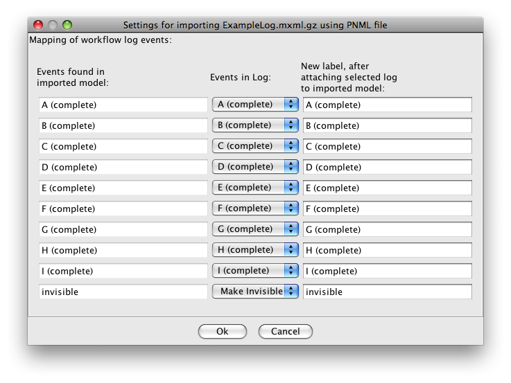 Note 3 that all log events that are not associated to any task in the model will be removed from the log by ProM - a separate dialog will warn you about this.