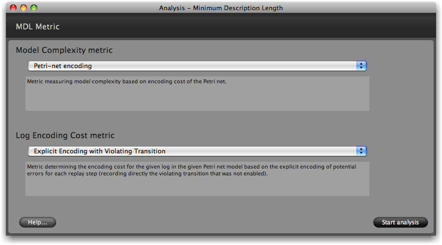 When the Minimum Description Length plug-in is started, first the desired log compression and model complexity encodings can be chosen. The encodings discussed in [1] are selected per default and are recommend. Note that other encodings can be easily added to the plug-in.