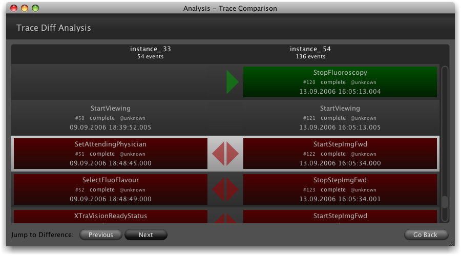 Visualizes the differences in two selected traces from the log based on the typical 'longest common subsequence' analysis that is employed to create diffs in versioning systems etc.