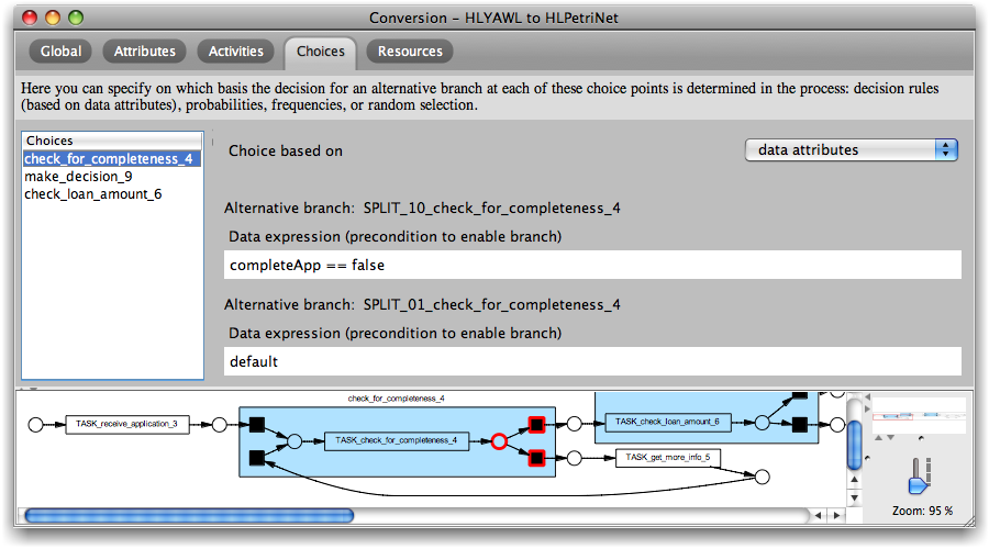 Choice SettingsDecision points in the process model are automatically detected and displayed in the list to the left (and highlighted in the process model at the bottom). For each of these choices, the following options exist.