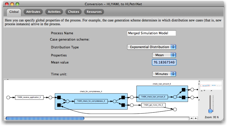 Activity SettingsThe “Activities” tab holds information for each activity in the process. Double-clicking an activity in the list brings up the activity settings, plus it highlights the corresponding node in the graphical model at the bottom. For each activity the following parameters can be specified: